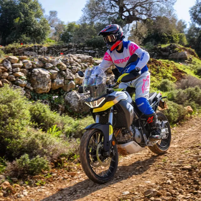 Con cuatro modos de pilotaje, dos de los cuales se pueden ajustar individualmente, puedes elegir en función del estilo de uso y la superficie que desees. En el modo todoterreno, puedes desactivar la función ABS por completo o solo en la rueda trasera. Con control de tracción, control de crucero, varias opciones de mapa del motor y freno motor, APRC (Aprilia Performance Ride Control) te ofrece más funciones de asistencia que son claramente visibles en el salpicadero TFT de 5 pulgadas.