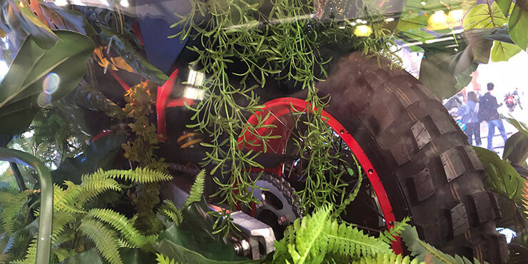 Ahora bien, es muy difícil saber qué está pasando con la Aprilia Tuareg 660, ya que… bueno, los italianos la cubrieron de arbustos. Tal fue el estado de su exhibición en la feria de Milán.