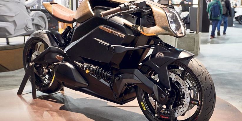 De hecho, la carrocería es bastante mínima. El faro, la sección del «tanque» (donde se encuentra el puerto de carga CCS CC) y el asiento son una sola pieza que se asienta sobre el monocasco de carbono principal, que alberga las celdas de la batería. Un protector de motor generalmente oculta el motor de CA de imán, pero los lados visibles de la moto son el monocasco en sí.