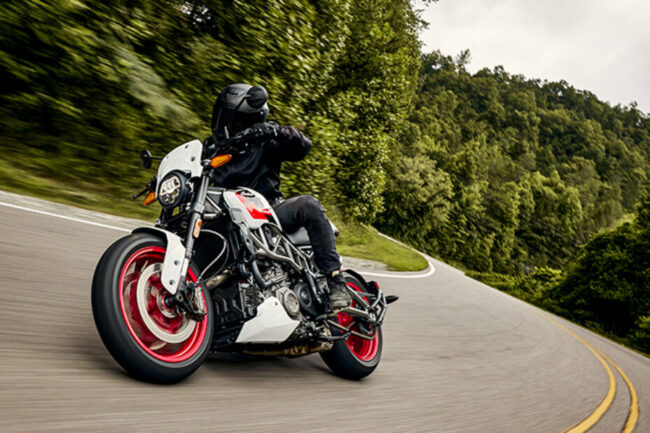 Esta Indian FTR monta un motor V-twin a plena vista, estrechamente rodeado por un elegante marco de…
