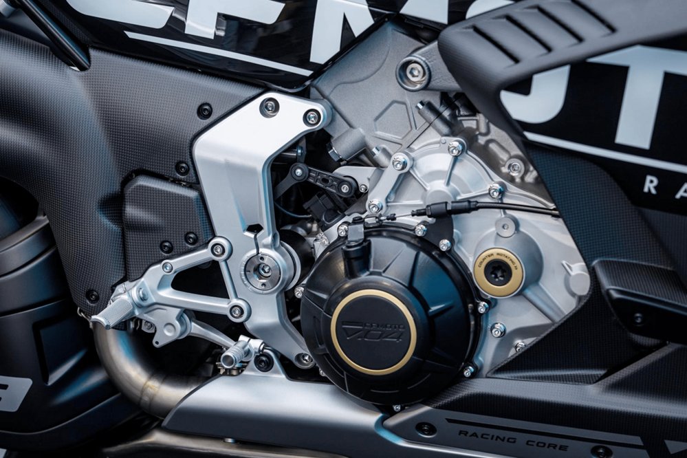 Cigüeñal contrarrotante (como en Ducati/MotoGP), que reduce el efecto giroscópico de las ruedas, mejorando la agilidad en los cambios de dirección. El motor es parte estructural del chasis (stressed member).
