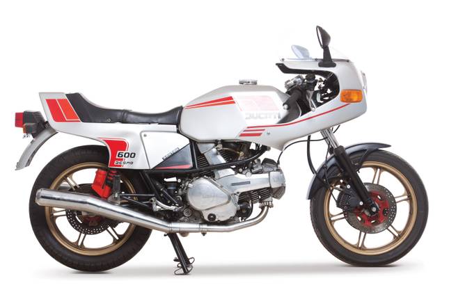 La moto con el distintivo carenado plateado con inserciones rojas y llantas de aleación Campagnolo doradas, en el corazón de la moto se encuentra un motor bicilíndrico en V SOHC Desmo de 583 cc que envía potencia a la rueda trasera a través de cinco velocidades.