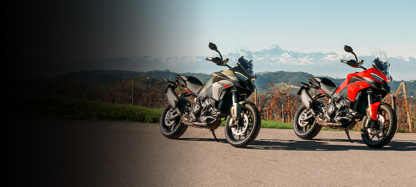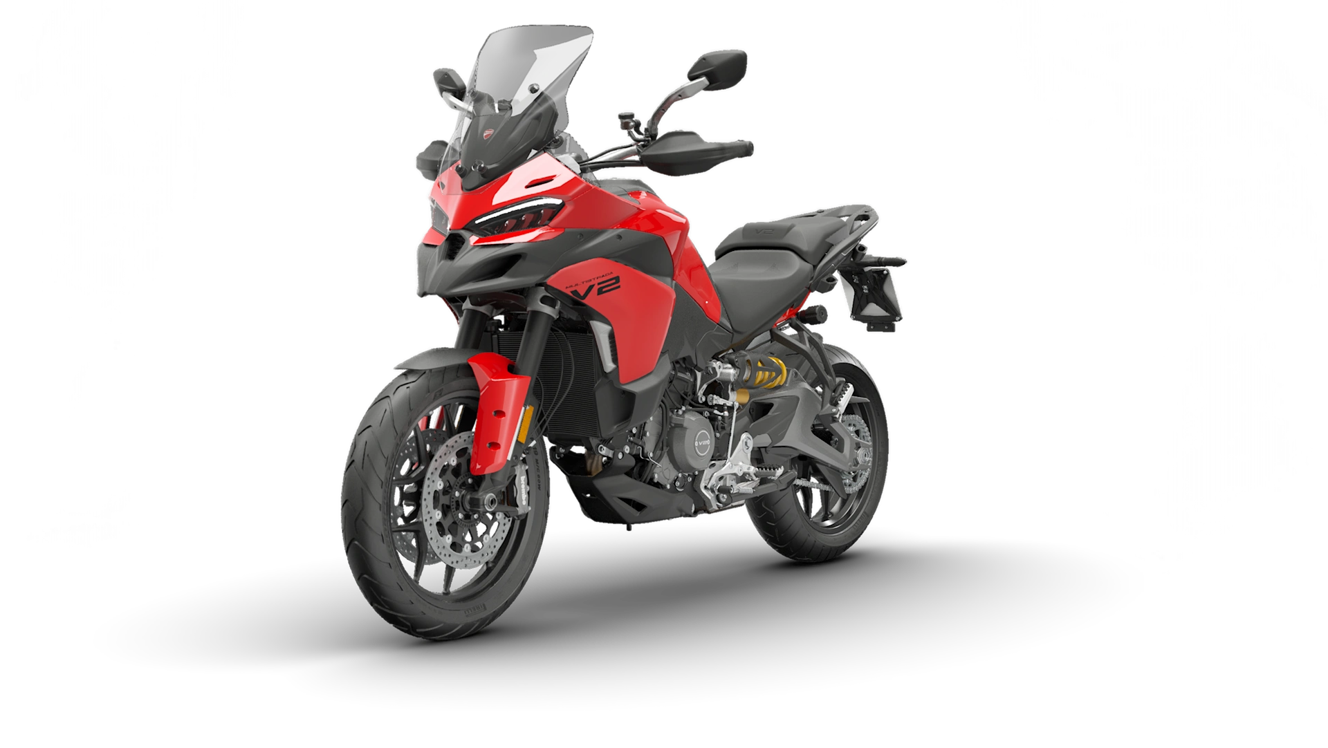 Parte ciclo: El chasis monocasco de aluminio y las suspensiones de largo recorrido (170 mm) proporcionan una solidez abrumadora. La versión V2 S con el sistema semi-activo Ducati Skyhook Suspension (DSS) mejora aún más el confort y la capacidad de absorber irregularidades, manteniendo la estabilidad.