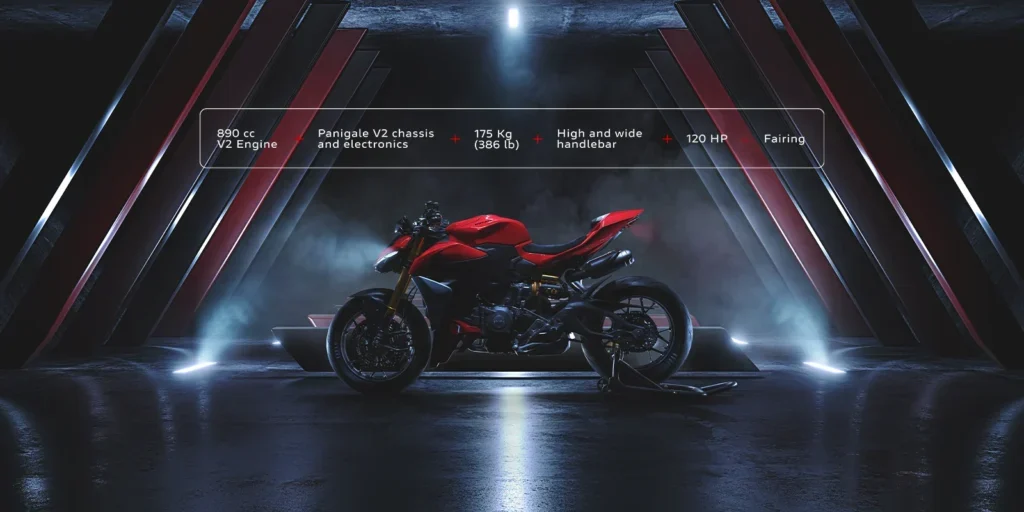 Ducati ha aplicado la Fight Formula a la Panigale más ligera de la historia para crear la Streetfighter más ligera de la historia: una emocionante moto naked en la carretera y una de alto rendimiento en el circuito. La fórmula es sencilla: motor de 890 cc, chasis Panigale V2, 175 kg de peso, manillar ancho y alto, y sin carenado que actúe como filtro entre las emociones del piloto y el pilotaje.