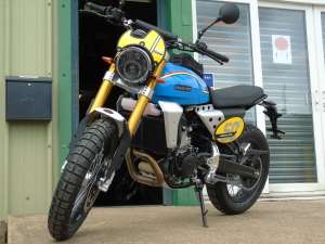 La brillante Caballero Scrambler Anniversary Edition. Basada en el motor monocilíndrico de 449 cc y con un peso de solo 150 kg, la Scrambler es una auténtica todoterreno. Con el detalle de la bandera italiana en el tanque y la mosquitera, la Anniversary destaca.