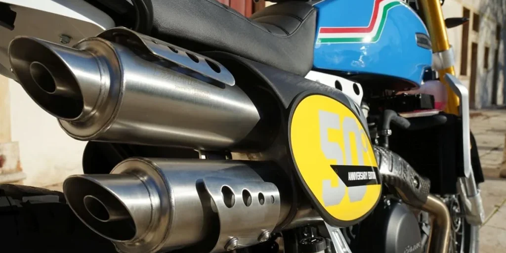 La brillante Caballero Scrambler Anniversary Edition. Basada en el motor monocilíndrico de 449 cc y con un peso de solo 150 kg, la Scrambler es una auténtica todoterreno. Con el detalle de la bandera italiana en el tanque y la mosquitera, la Anniversary destaca.
