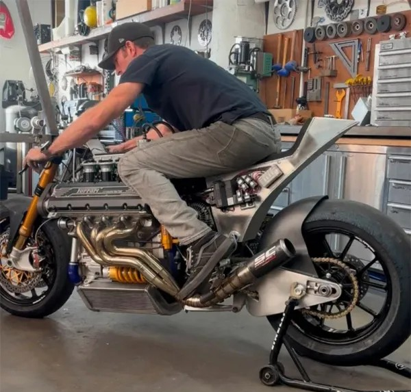 Motor: Este es el punto central del proyecto. El motor es un V8 de 3,5 litros de un Ferrari 355, un motor que en su configuración original en el coche producía alrededor de 380 cv. El objetivo es mantener el peso de la moto por debajo de los 226 kg, lo que, en teoría, le daría una relación peso-potencia extrema, muy superior a cualquier superbike comercial.