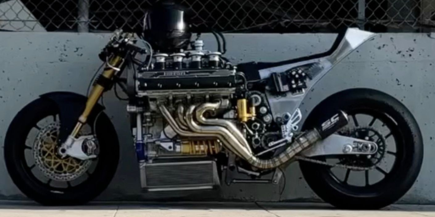 Motor: Este es el punto central del proyecto. El motor es un V8 de 3,5 litros de un Ferrari 355, un motor que en su configuración original en el coche producía alrededor de 380 cv. El objetivo es mantener el peso de la moto por debajo de los 226 kg, lo que, en teoría, le daría una relación peso-potencia extrema, muy superior a cualquier superbike comercial.