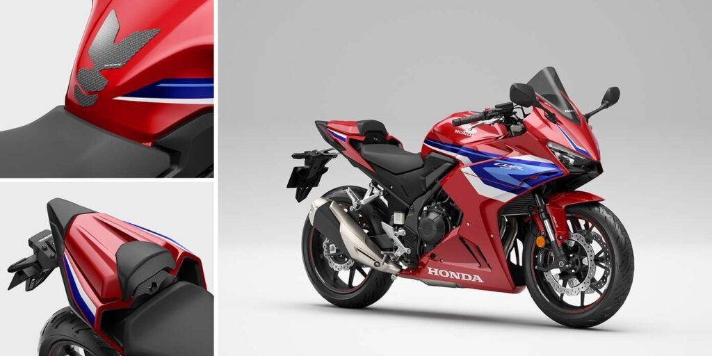 La altura del asiento es baja, 790 mm, lo que hace que la CBR500R sea fácil de manejar, y su posición de pilotaje se adapta cómodamente a usuarios de diferentes alturas. Las dimensiones totales son 2080 mm de largo, 765 mm de ancho y 1145 mm de alto, con 5.1 pulgadas de distancia al suelo. El tanque de combustible tiene capacidad para 17 litros, incluida la reserva.