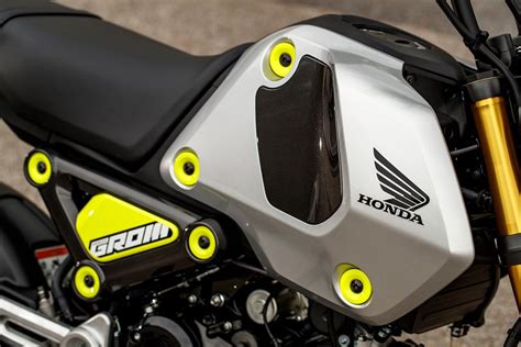 Hay una cubierta de tanque completamente nueva y «bien definida» con recortes en las rodillas, además de paneles laterales nuevos y una pequeña bandeja. La cuestión es que, con sus proporciones distintivas (y diminutas) restantes, además de la retención del antiguo grupo de faros LED y la unidad de asiento, puede que te lleve un momento o dos reconocer al Grom que pasa por delante de ti, es la moto de antes o después del lavado de cara.