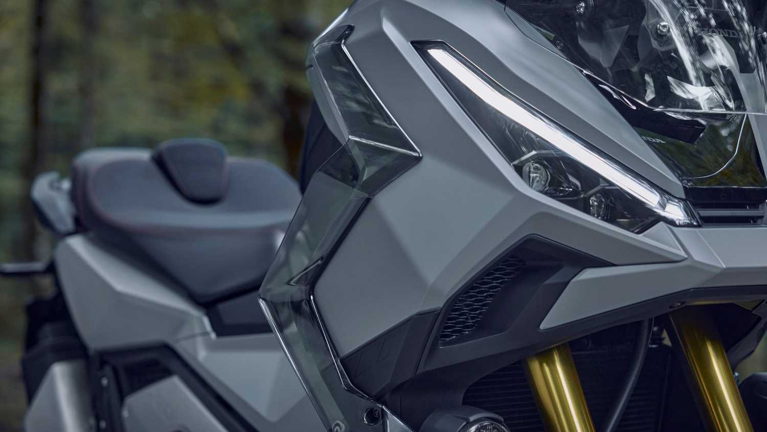 Las especificaciones del equipo es donde aparecen el resto de las actualizaciones del X-ADV 2025. Trabajando de adelante hacia atrás, el Honda tiene una nueva cara: la parte delantera del carenado se ha rediseñado para proporcionar un aspecto más angular, pero también más coherente. Los proyectores LED sustituyen a los faros apilados, y una tira de luces diurnas en la parte superior incorpora los intermitentes, por primera vez en una moto de producción.