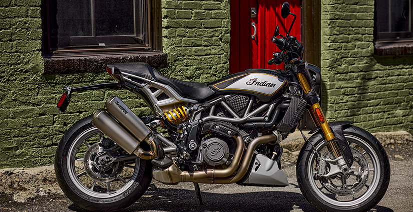 La Indian FTR R Carbon, utiliza llantas en fundición de aluminio de 17 pulgadas calzadas con neumáticos Metzeler Sportec M9 RR, por lo menos en esta unidad de pruebas, suspensión Öhlins multirregulable (horquilla invertida 43 mm con botellas doradas y monoamortiguador sin bieletas con botella de gas separada), nuevas geometrías (ángulo de lanzamiento más pronunciado, 25° y menor avance 99,9 mm, menor distancia al suelo y manillar ProTaper estrechado 4 cm.