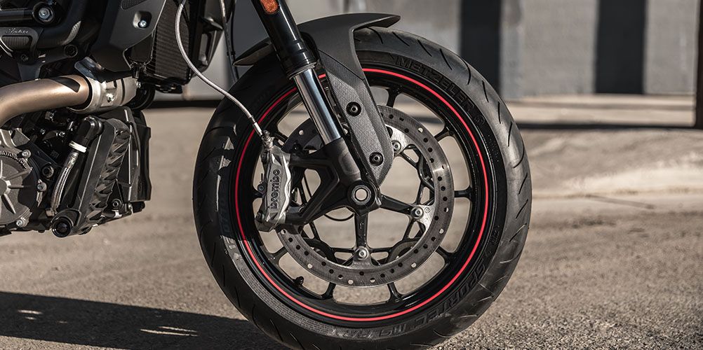 Los frenos Brembo se encargan del negocio con pinzas dobles de cuatro pistones que muerden discos delanteros de 320 mm de una pinza de doble calibre y discos de 260 mm. El ABS viene con el paquete de equipamiento estándar.