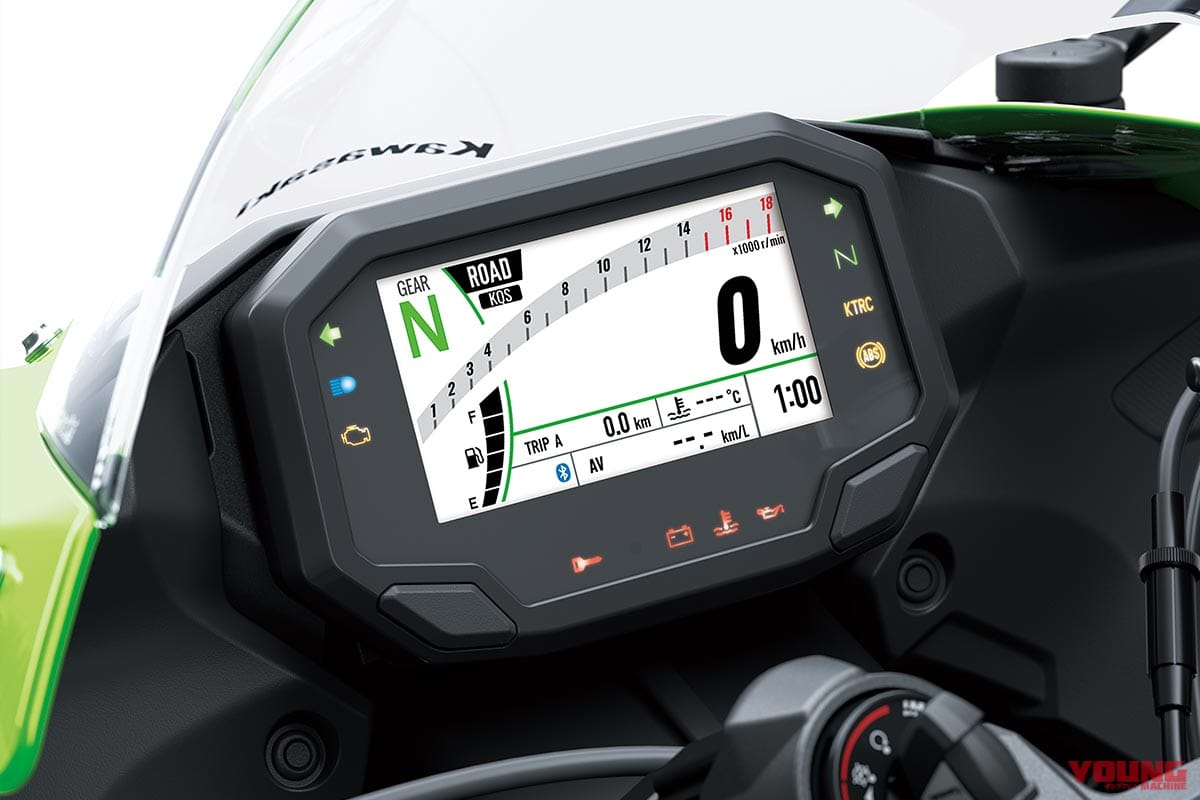 El motor entrega 129 cv y está equipado con un nuevo modo de pilotaje integrado. El medidor ahora tiene una pantalla TFT a color de 4,3 pulgadas y se puede conectar a un teléfono inteligente a través de la aplicación Rideology. También están disponibles el sistema inteligente de frenos antibloqueo de Kawasaki (KIBS), el cambio rápido de Kawasaki (KQS), la horquilla delantera invertida SFF-BP de SHOWA, la pinza radial + doble disco 310mm.
