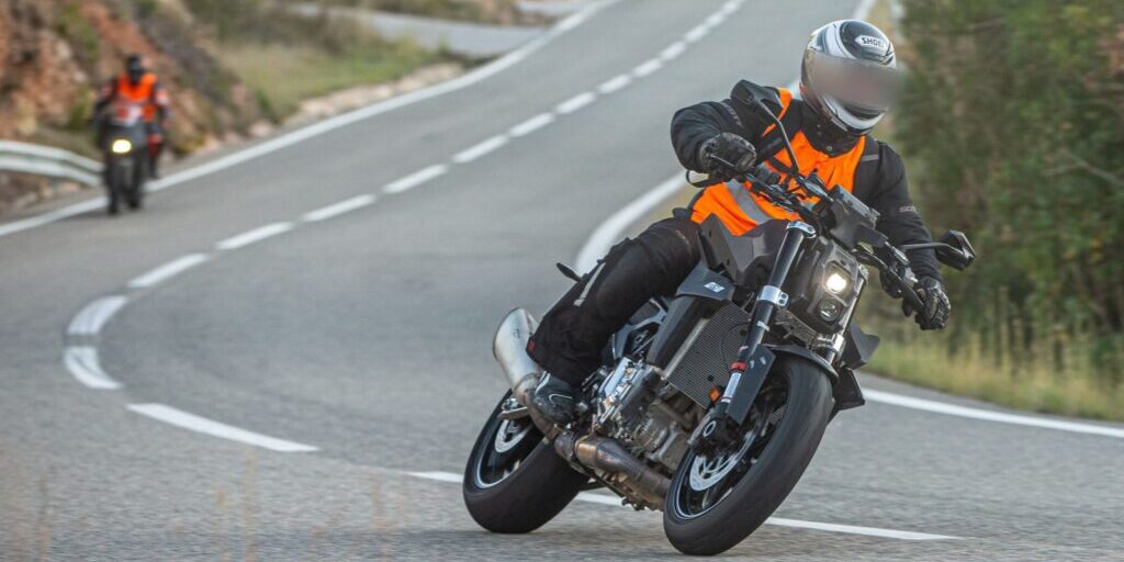 La mayor diferencia visible en estas fotos es el faro delantero y el carenado. Mientras que el faro y el carenado de la Duke R 890 2023 parecen ser una unidad sólida con un faro grande en el centro, la moto de prueba 990 Duke presenta una discreta parrilla angular que rodea un faro mucho más pequeño. A pesar de su tamaño reducido, la luz LED da una impresión persistente de brillo, incluso en el día soleado en que se tomaron las fotos. El basculante también parece haber sido cambiado con respecto a la 890 Duke R.