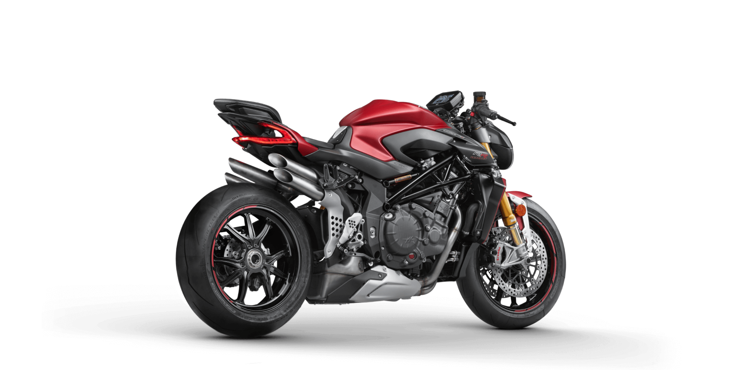 Componentes de carbono: Cubierta de la caja de aire – Cubierta del mazo de instrumentos – Panel central RH/LH para el depósito de combustible – Panel lateral RH/LH para el depósito de combustible – Tapa central y lateral para el proyector Tapas del embrague y de la caja de cambios Entrada de aire exterior RH/LH Características exclusivas: Cigüeñal más ligero – Nueva cámara de combustión Pistones más ligeros – Bielas de titanio Salpicadero TFT de 5,5″ a color – Control de crucero Bluetooth – GPS – MV Ride App para la duplicación de la navegación, Configuración del motor, la suspensión y las ayudas al piloto controladas por una aplicación – Control de lanzamiento – Control de elevación delantero FLC – Sistema antirrobo Mobisat con geolocalización
