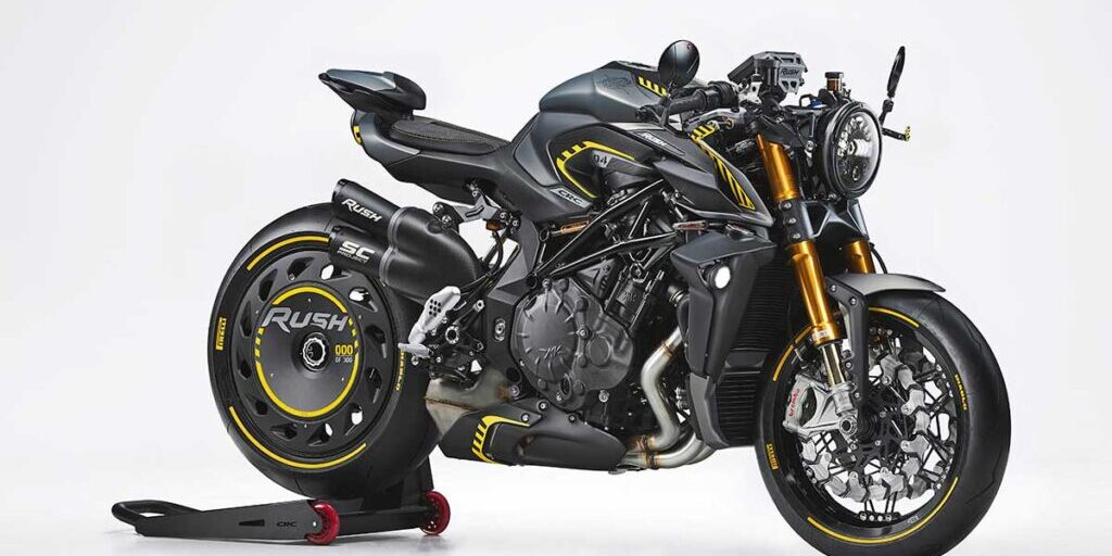 MV Agusta Rush 1000 2024, estará disponible en color Surreal White Gloss. La Rush 1000 tendrá un motor de 4 cilindros de 998 cc, 79 mm de diámetro, 50.9 mm de carrera, 208 cv (153 kW) a 13000 rpm de potencia, 116,5 Nm a 11000 rpm de par, y la transmisión es de 6 velocidades.