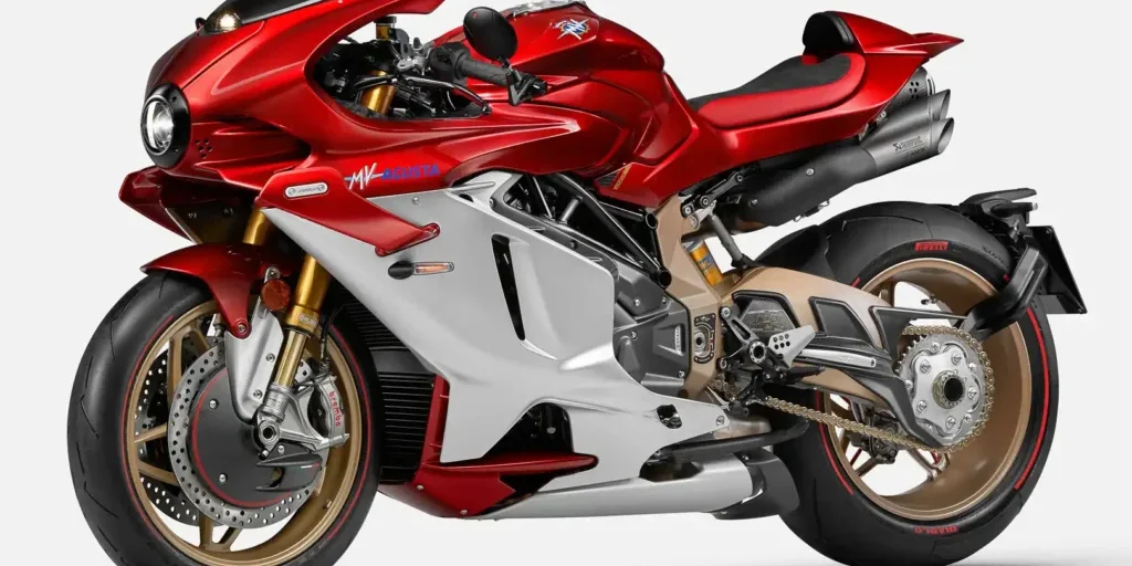 Las icónicas llantas están inspiradas en las estilizadas en forma de estrella que aparecen en la legendaria MV Agusta F4 750 Serie Oro, reinterpretadas con un ejercicio estilístico que une el pasado y el futuro a través de una mezcla de llantas de fundición y radios. El homenaje a la F4 también es evidente en el escape de titanio de 4 salidas desarrollado por Akrapovic específicamente para la Superveloce 1000 Serie Oro. Este escape, con su característica forma de «tubo de órgano», está ajustado para dar a la moto un sonido icónico y distintivo, realzado aún más por un escudo térmico de fibra de carbono.