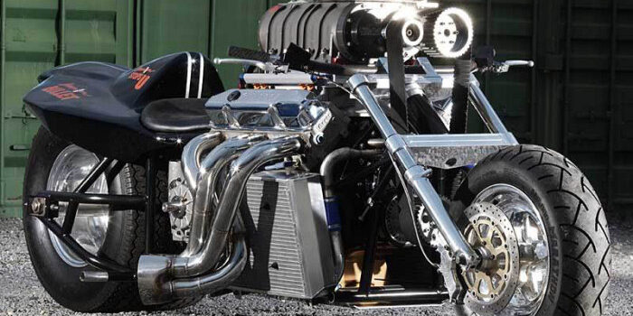 La moto que es legal para rodar por la calle equipa un motor de camión monstruo V8 sobrealimentado de 8,2 litros que desarrolla 1200 cv. La moto funciona con alcohol puro y con una tasa de consumo de combustible alto, también tiene un apetito monstruoso. La monstruo pesa 450 kg con una distancia entre ejes súper larga para evitar que te la pongas de sombrero hacia atrás bajo una aceleración brusca, pero incluso entonces, la relación peso-potencia es el doble que, por ejemplo, en una GSX-R1000 o ZX-10R.