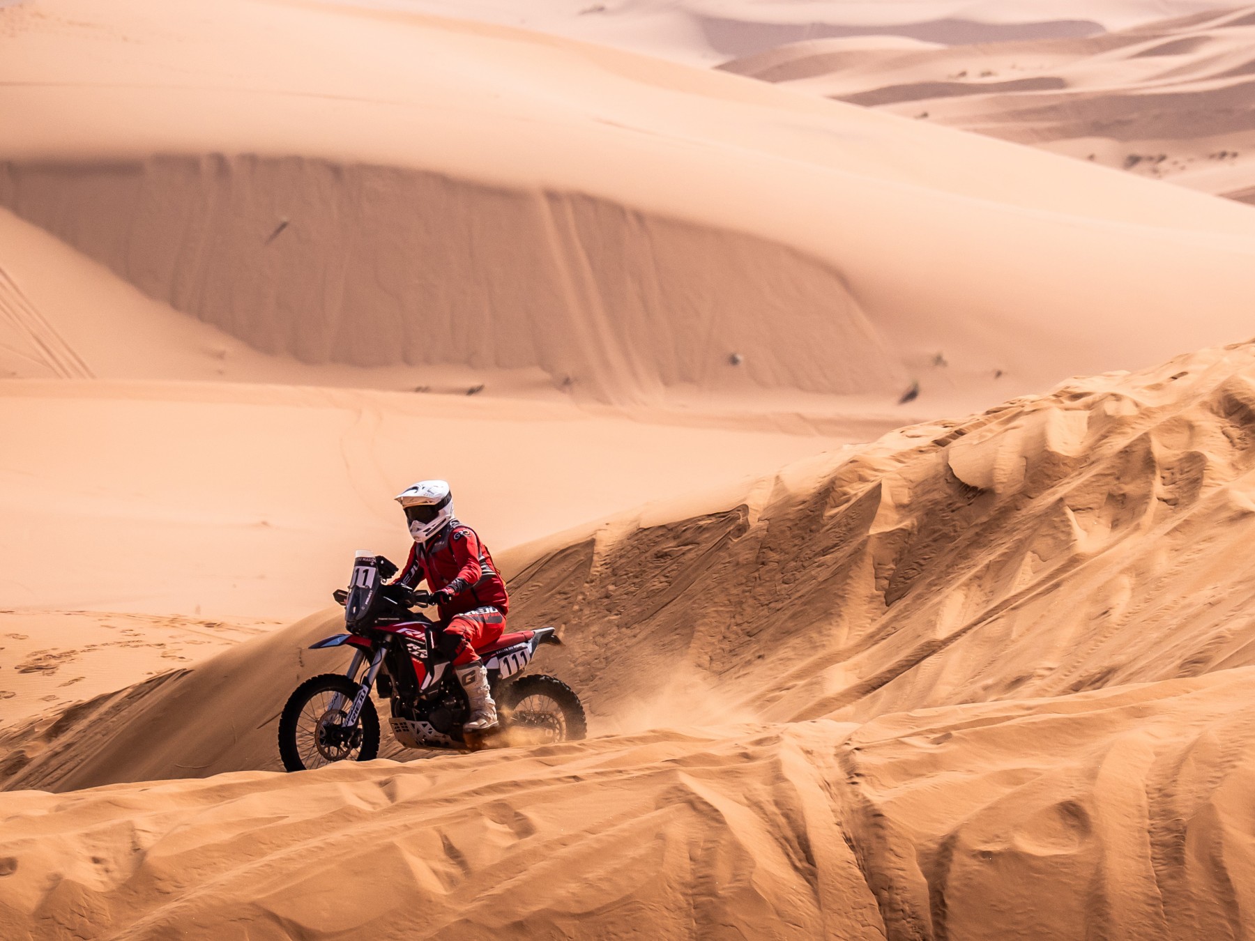 El triángulo formado por el manillar alto (estilo Fatbar), los estribos anchos y el asiento plano permite una transición sentado-de-pie impecable. La estrechez del conjunto a la altura de las rodillas facilita el control de la moto con el cuerpo, permitiendo «remar» en zonas de arena con total naturalidad.