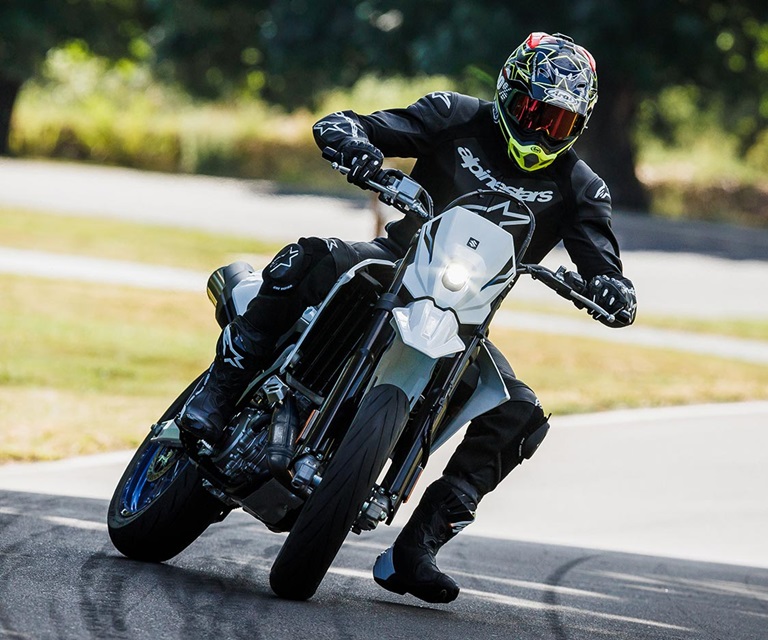 Las llantas de radios anchos de 17 pulgadas de la DR-Z4SM están diseñadas para permitir una sensación agresiva de SuperMoto que esta moto puede lograr. La suspensión KYB totalmente ajustable y los nuevos neumáticos Dunlop SPORTMAX Q5A garantizan un manejo y un agarre óptimos. La elegante iluminación LED, la carrocería vibrante y los toques ergonómicos completan la moto, lo que convierte a la DR-Z4SM en el paquete definitivo.