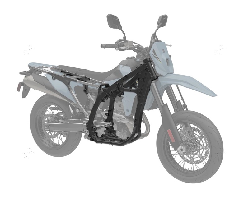 El bastidor rediseñado combina componentes de fundición con finos tubos de acero al cromo-molibdeno para una rigidez torsional excepcional con un peso mínimo. Está formado por un tubo de acero que lo hace rígido, fuerte y flexible para manejar superficies rugosas y mejorar la comodidad del piloto.