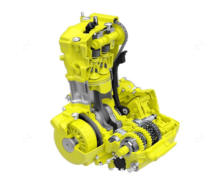 El motor DOHC monocilíndrico de cuatro válvulas y 398 cc completamente revisado ofrece una distribución suave y controlable del par desde bajas revoluciones hasta la potencia máxima. Los nuevos árboles de levas de mayor elevación con solapamiento reducido presionan sobre las nuevas válvulas de admisión de titanio.