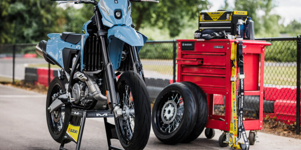 La nueva DR-Z4SM de Suzuki cuenta con un nuevo motor monocilíndrico DOHC de cuatro válvulas refrigerado por líquido de 398 cc con doble encendido, una transmisión de cinco velocidades y un embrague antirrebote que produce 38 cv a 8000 rpm y 37 Nm de par a 6500 rpm.