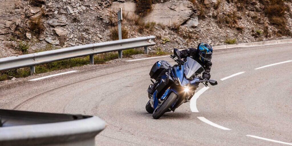 - Posición de pilotaje: Es más erguida que una superdeportiva, con un manillar más alto y ancho. Los reposapiés están en una posición intermedia, lo que reduce la fatiga en viajes largos.