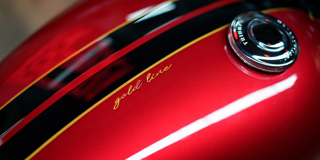 El taller de pintura de Triumph cuenta con expertos en revestimientos de oro pintados a mano líderes en la industria. Gold Lining es una habilidad que requiere las manos más firmes, una paciencia increíble y años de experiencia. Según Triumph, muchas ediciones Gold Line comienzan con un esquema base de dos colores. El punto donde se encuentran los dos colores se aplana y luego, con cuidado, se aplica a mano una línea dorada, generalmente en un trazo continuo por parte del artista. Los artistas utilizan un pincel de forro de espada de cerdas suaves muy especializado. Después de aplicar Gold Line, los artistas sellan la raya con una última capa transparente de laca. Esta capa transparente ayuda a proteger la delicada línea dorada del clima y otros elementos.