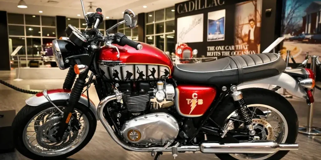 Triumph Bonneville T120 personalizada, basada en un nuevo modelo T120, presenta un esquema de diseño personalizado del galardonado artista J. Daar y está inspirada en las motos Memphis Mafia de 1964 y el trineo Stay Away Joe Desert de 1968, además de estar influenciada por el aspecto más icónico de Elvis en el Comeback Special de 1968. El diseño cuenta con letras doradas, que representan el nombre de Elvis escrito en luces, así como siluetas sobre un fondo rojo, haciéndose eco del diseño de la escenografía de su actuación más famosa en el ’68 Comeback Special.