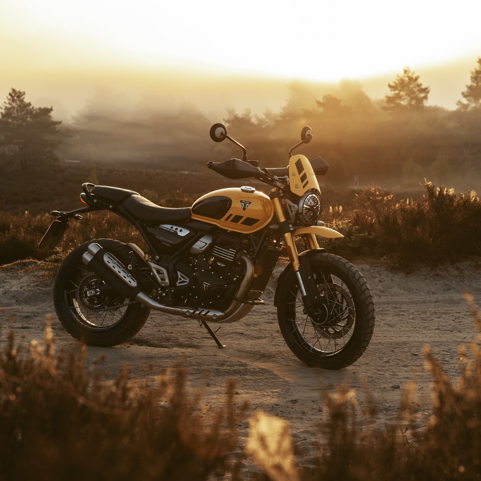 El diseño incluye detalles retro como el escape elevado y el asiento plano, evocando las scramblers clásicas, mientras que la instrumentación digital, la iluminación LED y los acabados modernos aseguran confort y funcionalidad. La Scrambler 400 XC es ideal para personas entusiastas que buscan una moto versátil para el día a día y escapadas de aventura, con la confiabilidad característica de Triumph y opciones de personalización para adaptarla al estilo propio.