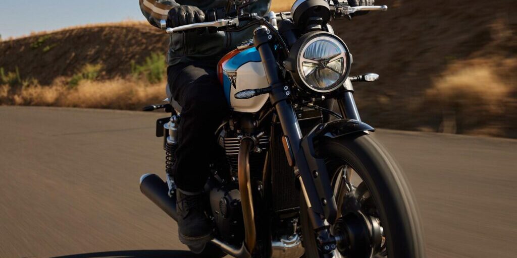 En la parte delantera, la antigua horquilla convencional ha desaparecido, reemplazada por una unidad invertida Marzocchi de 43 mm. Marzocchi también suministra las nuevas unidades de amortiguador con depósito a cuestas. Si bien hay poco en términos de ajuste (solo precarga trasera), los cambios cuando se combinan con ese nuevo basculante de aleación más rígido deberían hacer una mejora notable. La geometría sigue siendo más relajada que la Speed Twin 1200 más grande, con una llanta delantera de 18 pulgadas emparejada con una trasera de 17 pulgadas, junto con un ángulo de inclinación de 24,9 grados. El frenado se ha mejorado con la adición de una sola pinza de cuatro pistones montada radialmente en lugar del diseño anterior de montaje axial. Más importante aún, esos frenos ahora tienen ABS en curvas, y el sistema de control de tracción también es sensible a la inclinación para 2025.