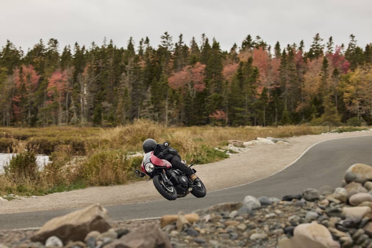 La Triumph Thruxton 400 entra en curva con solo pensarlo. La salida es limpia gracias a un control de tracción que no es intrusivo (se puede desconectar si te sientes valiente). El aplomo es sorprendente para una moto de menos de 180 kg; se siente «plantada» en el asfalto.