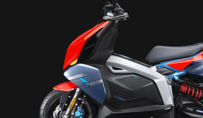 TVS la define como una “Crossover Eléctrica Premium”. Visualmente es agresiva, con un diseño “Exoskeleton” que deja ver su estructura. Es futurista, minimalista y parece sacada de una película de Tron.