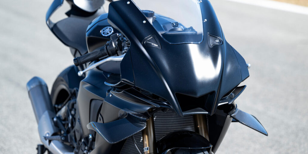 Los alerones aerodinámicos de estilo MotoGP instalados en la parte superior del carenado principal se diseñaron y desarrollaron a partir de los comentarios técnicos del equipo Yamaha Factory Racing MotoGP. Fabricados en fibra de carbono para añadir el menor peso posible al tiempo que garantizan la resistencia y la rigidez, los winglets no sólo generan carga aerodinámica, sino que también ofrecen una mayor sensación de estabilidad en la parte delantera.